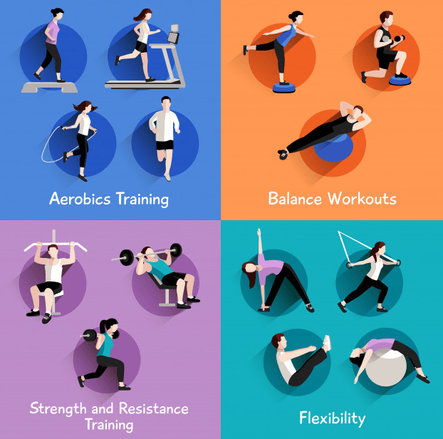 - Strength: push-ups, planks, squats, lunges, sit-ups, weightlifting